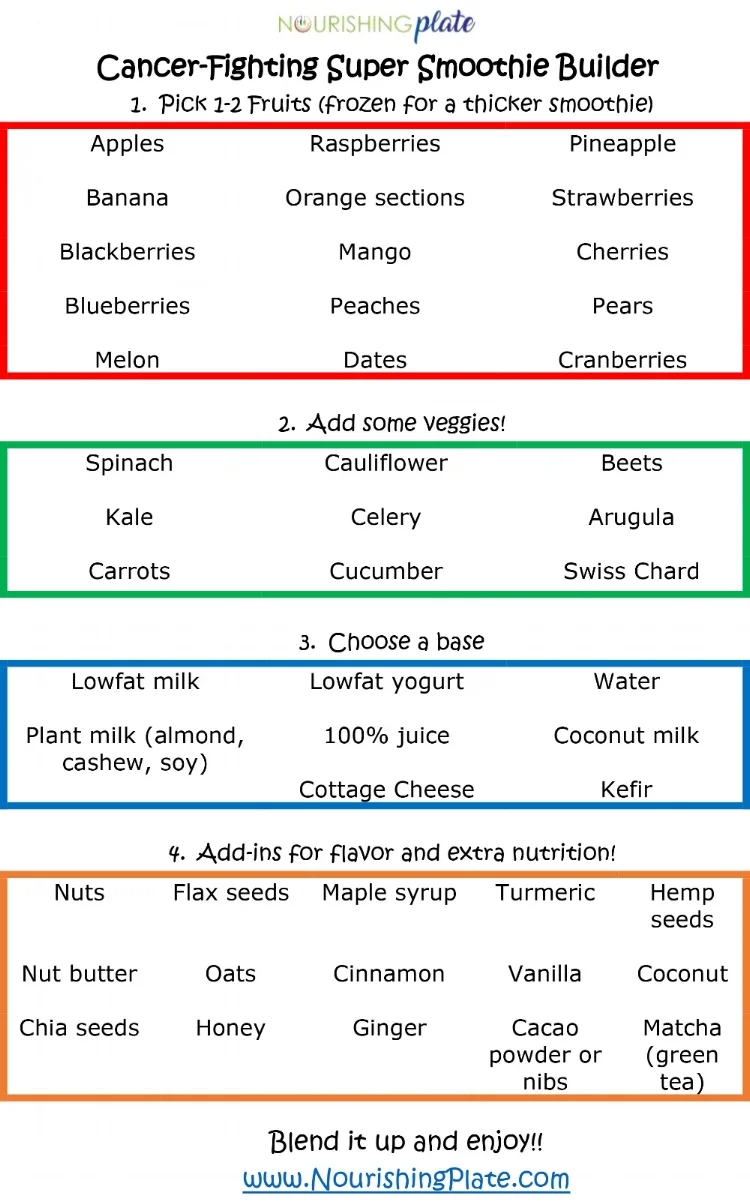 I'm not the most creative when it comes to smoothies so I put together this template to help me pick and choose ingredients for my smoothie inventions! Feel free to print or download this Cancer-Fighting Super Smoothie Builder to help you create tasty and nourishing smoothies!